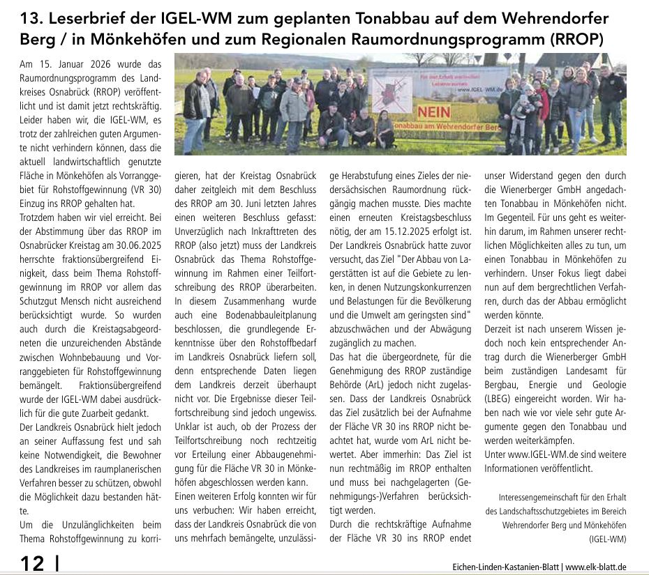 13.02.2026: Der 13. Leserbrief unserer Interessengemeinschaft ist erschienen in der Ausgabe Wo. 04 vom 24.01.2026 des Eichen-, Linden-, Kastanienblattes (Ausgabe 1837) www.elk-blatt.de Februar 13, 2026Februar 23, 2026admin